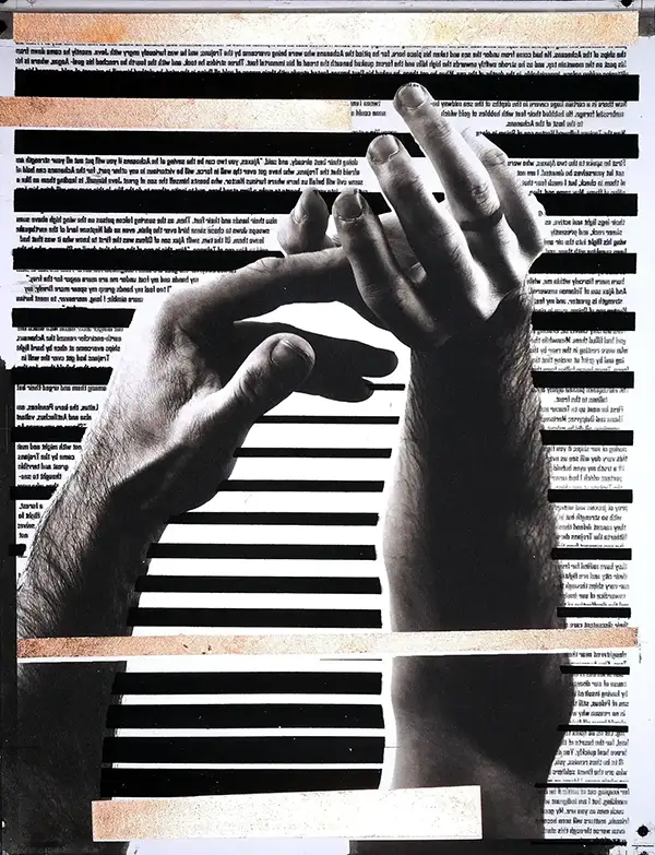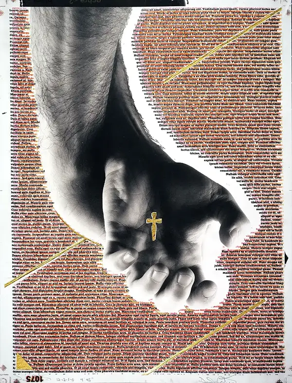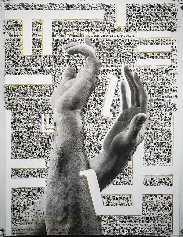 The hand appears throughout the series. Sometimes it is clearly visible, sometimes it is only implied. The presence of the hand is a way to speak about gesture, touch, and absence without using direct narrative. I also incorporate letterforms and symbols, often derived from theological or philosophical texts, but I alter them so they cannot be read. Their role is to exist visually, to carry weight without delivering a message.